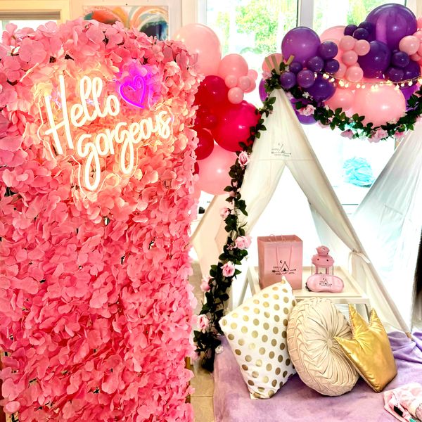 Our Sleep & Spa Package combines the fun of a slumber party with the relaxation of a spa day. This dreamy experience includes our Premium themed teepee tents, a beautifully styled spa table, comfy seating, a complete skincare routine with face masks, mirrors, headbands, bowls, and spa robes for each guest to keep. Plus a mini photo backdrop with balloons for those picture-perfect moments.